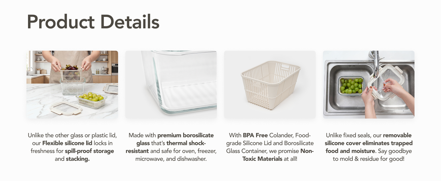 A practical colander container set designed for rinsing, draining, storing, and serving fruits, vegetables, and salads. The removable strainer and secure silicone-seal lid make food prep and storage simple and mess-free.